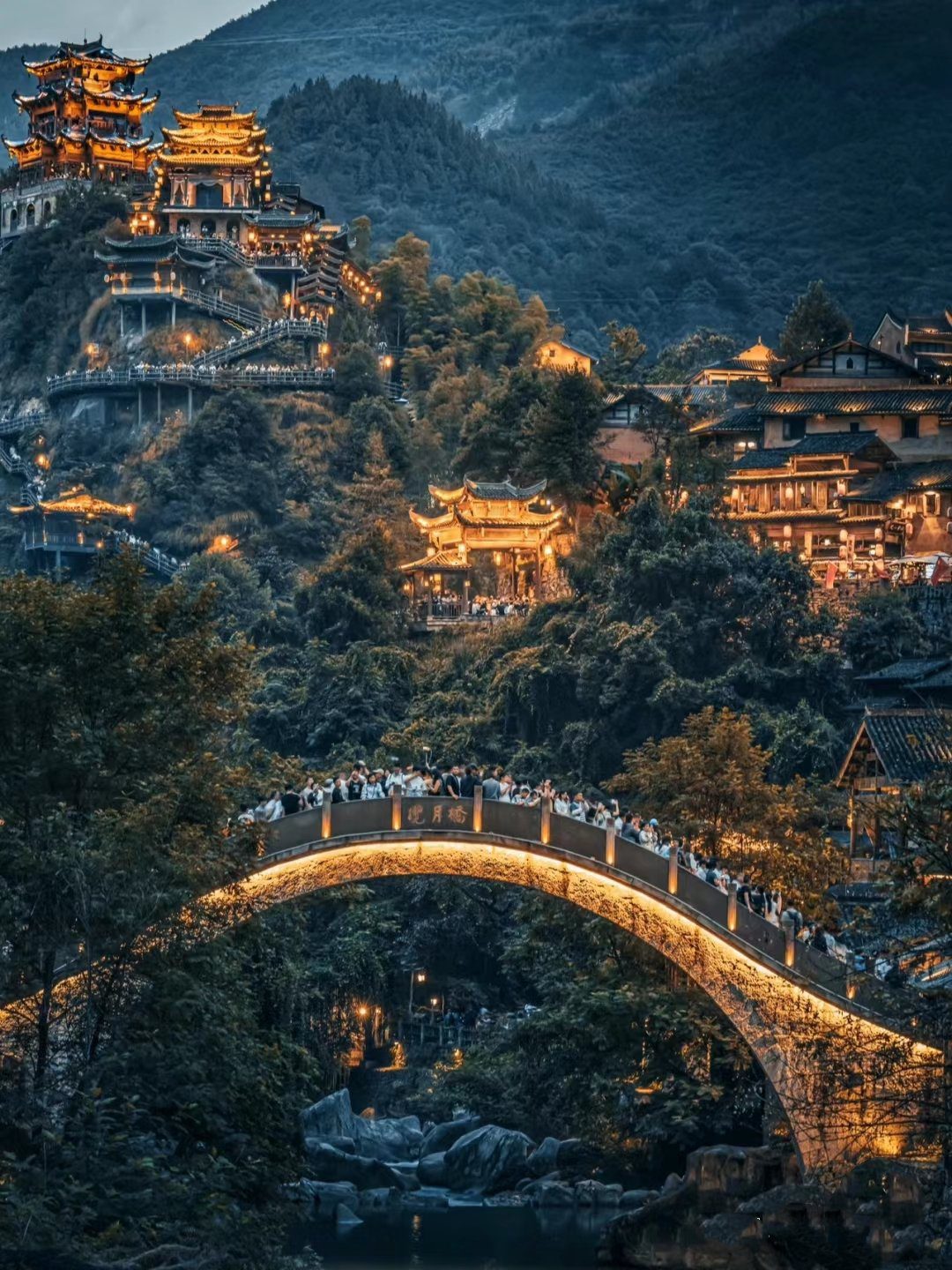 • Upon arrival, wear the Hanfu to experience the fairy street, food street, and enjoy the bonfire party and water curtain movie in the scenic area.